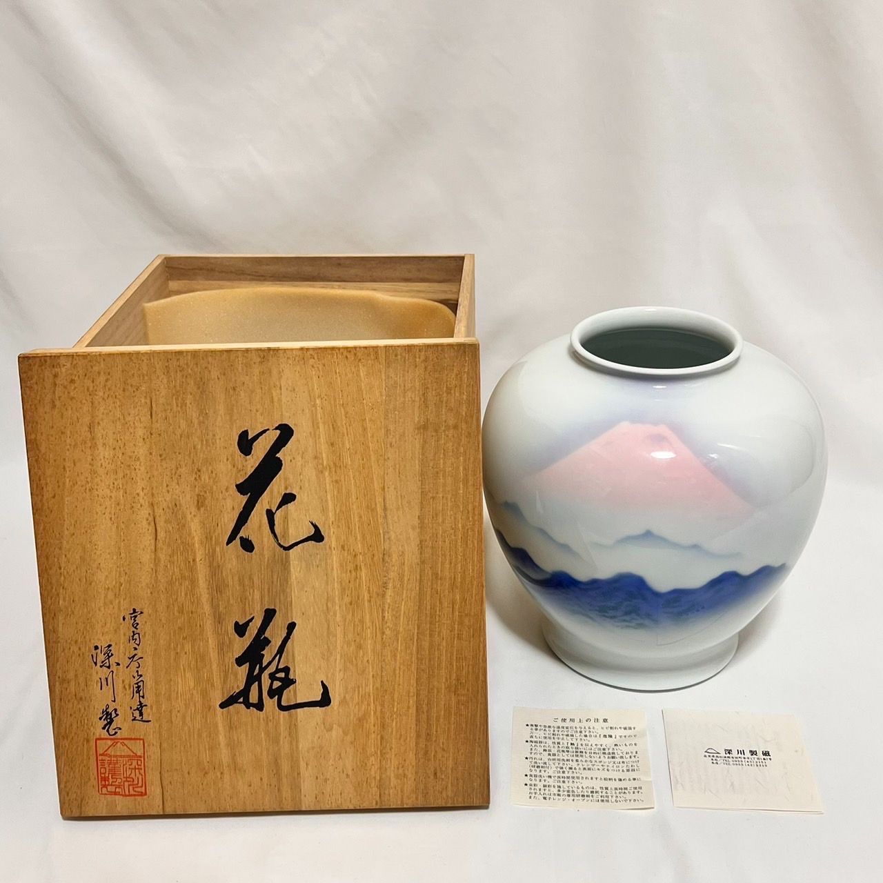 k004 深川製磁 官窯染付 赤富士 花瓶 共箱入り 赤く染まる神々しい富士山 k004 深川製磁 官窯染付 赤富士 花瓶 共箱入り 赤く染まる神々しい