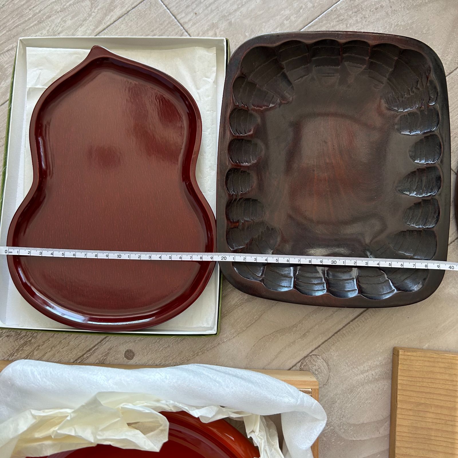 | 商品の特徴 | 讃岐彫【5枚セット】お盆 香川漆器 四角盆 香川県伝統工芸 どっしりした。讃岐彫【5枚セット】お盆 香川漆器 四角盆 香川県伝統工芸 どっしりした。讃岐彫【5枚セット】お盆 香川漆器 四角盆 香川県伝統工芸 どっしりした。この度はご覧いただきありがとうございます!讃岐彫の四角盆5枚セットですバラ売り不可×どっしりとした木地に、讃岐彫りならでは風情豊かなお品です曽祖母の代から大切に使ってきたもので、ところどころ傷があったりします。5枚を重ねて収納する事ができます。80年程は経っている古い物にしてはそこそこ美品と言える状態を保っていると思いますが、年代物につき匂いや 木の歪み、素人の検品による見落としなど 中古品をご理解頂ける方、よろしくお願いします。完売❣️伝統工芸 讃岐彫 四方盆5客 讃岐盆 会席膳。1枚だけは熱いものを置いたのか半円の形に跡がついています。BJ091 時代輪島塗 椿図研ぎ出し蒔絵 吸物椀 二客 木製 梨地 細密。多色花模様の陶器壺。使用していたものなので、汚れもありますが…素人が知識なく拭いたり磨いたりして艶がなくなってしまうのは怖いので埃を取る程度の 現状でのお渡しになります。波佐見焼染錦波兎魚型魚型 林九郎作魚型の陶磁器皿6枚セット(大・小)。大徳寺弁当 重箱 5組 飛騨春慶塗 木製漆器 懐石 その①。サイズ約33.3㎝×約32.2㎝×厚み約2.9㎝重さ1枚あたり約705g他にもサイズ違いで讃岐彫や後藤塗を出品しています!※撮影時の天候などにより、実物とお色が多少違ってしまう場合がありますがご了承ください※引越しに伴い、家族の物を整理中です商品は全て手元にありますのでご安心ください!購入時期など確認にお時間いただく場合もございますm(__)m#香川伝統工芸品#讃岐彫#讃岐漆器#しこく彫#漆器#拭き漆塗#角盆#角膳 #四角盆#四方盆#懐石膳 | ||