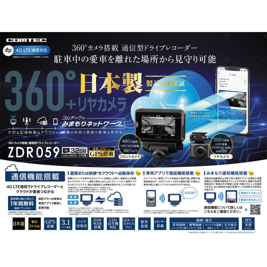 | 商品の特徴 | コムテック(Comtec) ZDR059 ドライブレコーダー 360°カメラ+リア。コムテック(Comtec) ZDR059 通信型ドライブレコーダー 前後2カメラ。コムテック【ZDR059】360°+リアカメラ搭載 通信型ドライブレコーダー。360度視野を提供するカメラ、COMTEC ZDR059。コムテック(Comtec) ZDR059 通信型ドライブレコーダー 前後2カメラ。スマホアプリから録画された映像や現在のカメラ映像を取得できます- モデル名: ZDR-059- カメラ: 360度カメラ、リアカメラ- 4GLTE通信ドライブレコーダ- 付属品: 配線、取扱説明書、32G SD(取付済)- ケーブル未使用ご覧いただきありがとうございます。ユピテルレーダーサクラ01。用品の種類...ドライブレコーダー本体撮影タイプ...360度撮影、後方撮影 | ||