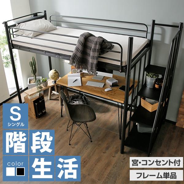 【シングル】システムベッド 階段付き スチール パイプベッドフレーム BLACK LOWYA(ロウヤ) ロフトベッド フレーム単品 シングルベッド 階段 階段