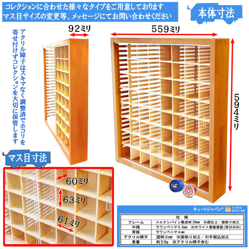 | 商品の特徴 | ヨーヨー 収納ケース ディスプレイ コレクション 棚 アクリル障子付。ヨーヨー ディスプレイケース 64マス アクリル障子付 メープル色塗装。bf53d585362e2dcab9ef5e16250afc。【本体寸法】巾559ミリ 高さ594ミリ 奥行92ミリ。【マス目寸法】 巾61ミリ 高さ63ミリ 奥行60ミリ。アクリル障子付の収納ケース 未使用製作品です。外枠にメルクシパイン集成材・中桟にたわみの無い5.5ミリ厚のラワンベニヤを使用しています。外枠をオイルステインメープル色塗装。温かみのある色に仕上げました。ヨーヨーなど64個収納可、コレクションを惹きたてるディスプレイケースです。アクリル障子は透明度が高く、大切なコレクションをホコリや傷から守ります。大事に保管したい皆さまにご満足いただける一品と自負しております。コレクター様に『こんなの欲しかった!』 そう言わせたい一心で製作しました。アクリル障子付ケースは3割を超える方がリピート(感謝!)されています。ありがとうございます。プレゼントに・・。ご自身用にもおすすめです。購入時の注意点:材料は建材を使用していますが、表面は天然木のため色目・木目・節の具合がその都度変わります。天然単板独特の節目・木目の濃淡・接ぎ目が目立つ場合がありますが、構造上問題はありません。製作では裏面の意匠は視覚的に重要視していません。ご了承ください。●スライド式障子は光線透過率93%の高品質アクリル板3ミリ厚を使用しています。引手加工をほどこしていますので開け閉め楽々です。●外枠に木目を活かしたパイン集成材を使用しています。長年お使いいただけるよう頑丈な造りとなっています。※中桟は固定式で可動はしません。サイズをご確認のうえご購入ください。ご購入された方の『コレ、また欲しい!』の嬉しいご感想を励み(ビタミン剤です!)にして、日々製作を行っております。製作・販売元 株式会社キュートジャパン#キュートジャパン#ヨーヨー#ゴルフ#ゴルフボール#コレクションケース#ディスプレイケース#収納棚#収納ケース種類...ショーケース・ガラスケース開閉方法...扉つき | ||