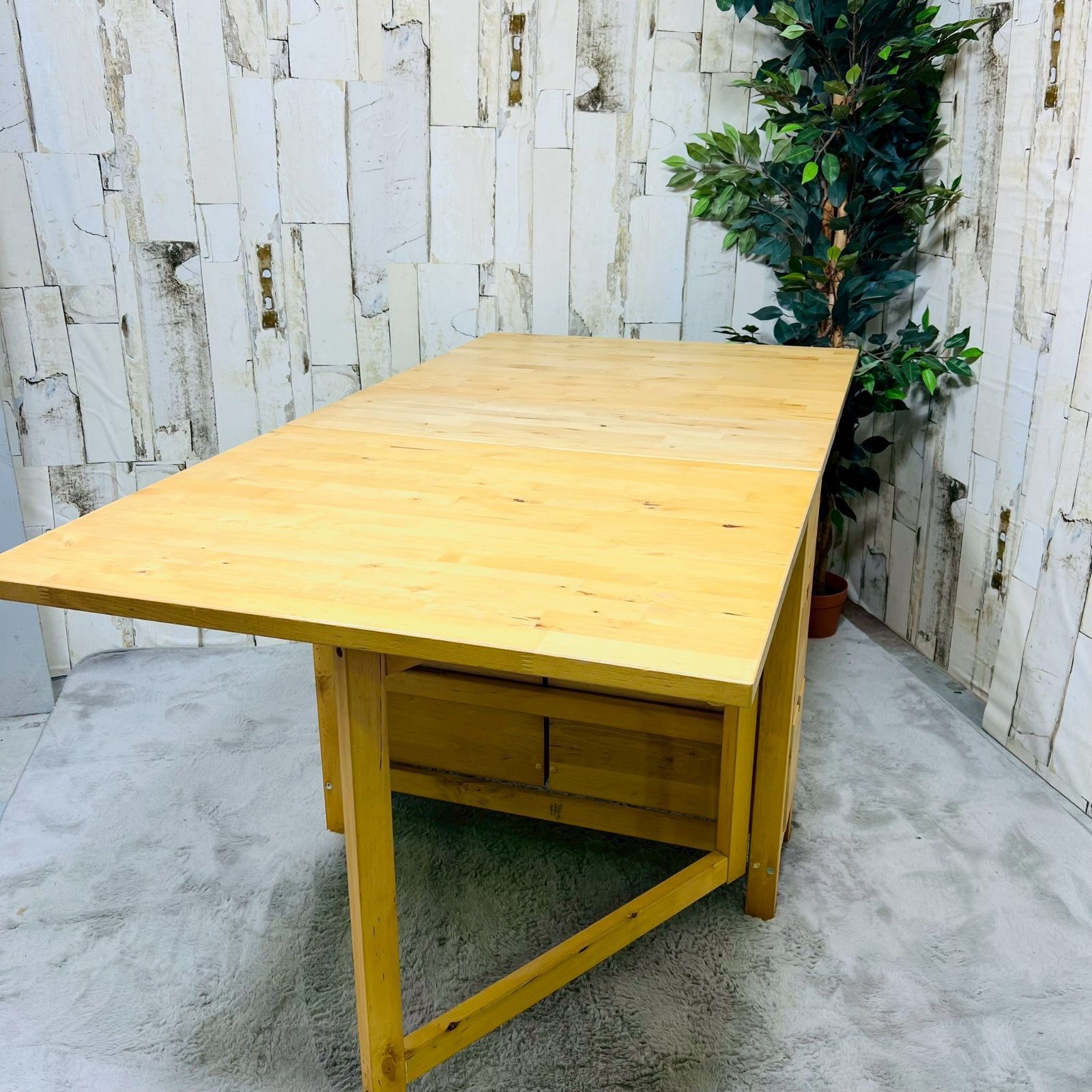 | 商品の特徴 | IKEA/ダイニングテーブル/ノールデン。IKEA 折りたたみダイニングテーブルノールデンNORDEN。IKEA 折りたたみダイニングテーブルノールデンNORDEN。■ カテゴリー:折り畳みテーブル■ メーカー:イケア IKEA■ シリーズ:NORDENノールデン■ カ ラー:ナチュラル■ 本体サイズ:8枚目画像でご確認ください■ 材 質:バーチ無垢材完成した状態でお送りするため、たのメル便を利用します。送料5,000円〜を含めていますので、お値下げできません。※ばらしてのお渡しをしないのは、①組立てのお手間をかけさせないため②パーツの有無などのトラブルを未然に防ぐためです。■商品説明IKEA 大人気の折り畳みテーブル、ノールデン色味はナチュラル温もりを感じる木製のテーブル。2人〜6人ほど使用可能です。引出しが両脇に6個あり収納力があります。折り畳めるので、限られたスペースを有効活用できます。ご自宅のダイニングテーブルとしてはもちろん、オフィスや店舗の作業用テーブルとしても便利です。私はPC作業用として使用していたので、このテーブルでの食事はしておらず、目立つ汚れもありません。■商品の状態目立つ傷や汚れなどなしきれいな状態かとは思いますが、あくまでも中古品であることをご理解ください。出品前に全面拭いておりますが、発送前にも改めて除菌します。本来なら組み立てが必要な商品ですがこちらは完成した状態でお届けしますので、届いたらすぐにお使いいただけます。※私は組み立てに2〜3時間かかりました。完成した状態での送料も含めていますので、お値下げできません。。イケア IKEA 折りたたみテーブル「ノールデン」、チェア「ノールドミーラ」。セラミック ダイニングテーブル 100cm ラウンドテーブル。【IKEA】EKEDALEN エーケダーレン 伸長式テーブル ダイニングテーブル。ノールデン 折りたたみ式ダイニングテーブル。※R RH ロンハーマン ダイニングテーブル。ヴィンテージ AD CORE ダイニングテーブル。Sale ウォールナット スクウェア 北欧ST ダイニングテーブル 幅180。クラッシュゲート デッケ ダイニングテーブル 103cm 丸テーブル。ダイニングテーブル3点 70cm 象嵌 イタリア 本革 革張り。ダイニングテーブル 円形 100cm マホガニー アンティーク。110cm ダイニング4点セット 回転チェア レトロモダン ウォールナット。SHUNO 変形ダイニングテーブル 180cm ナチュラル。イタリア ダイニング3点セット 70cm 象嵌 レッドストライプ 猫脚。ダイニングテーブル3点 80cm 象嵌 イタリア ブルー CHIC | ||